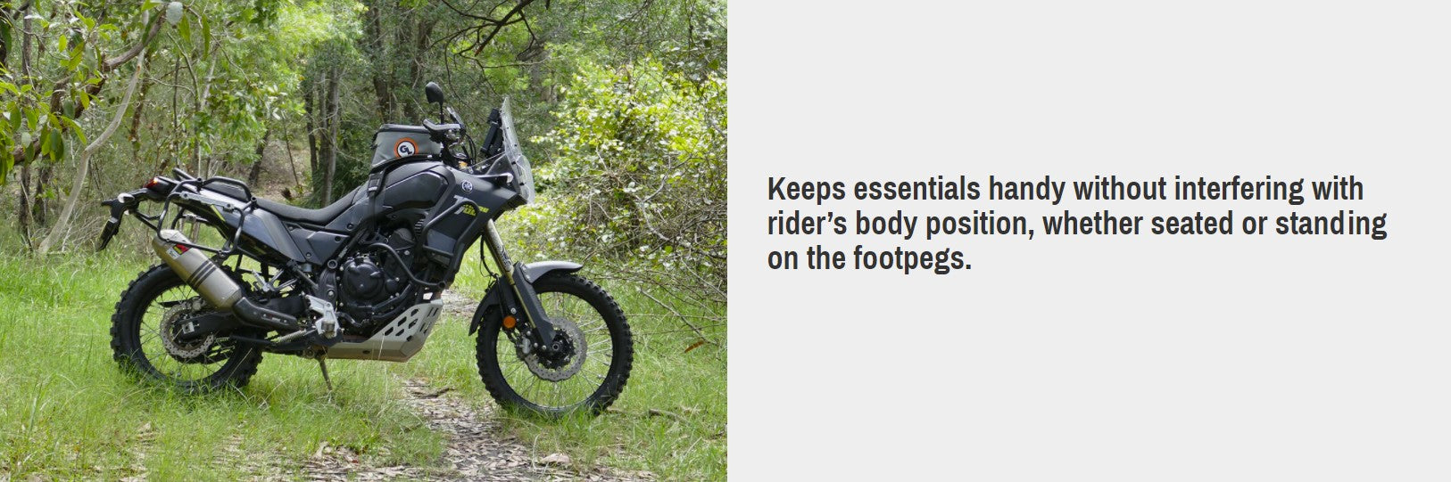 - Keeps essentials handy without interfering with rider’s body position, whether seated or standing on the footpegs.