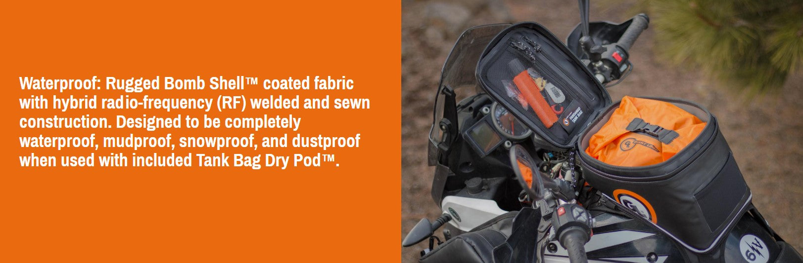 - Waterproof: Rugged Bomb Shell™ coated fabric with hybrid radio-frequency (RF) welded and sewn construction. Designed to be completely waterproof, mudproof, snowproof, and dustproof when used with included Tank Bag Dry Pod™.
