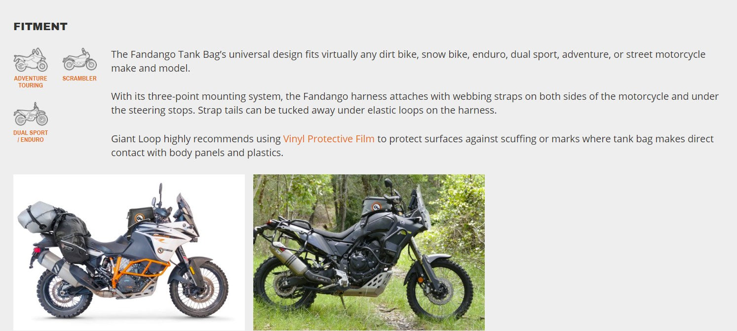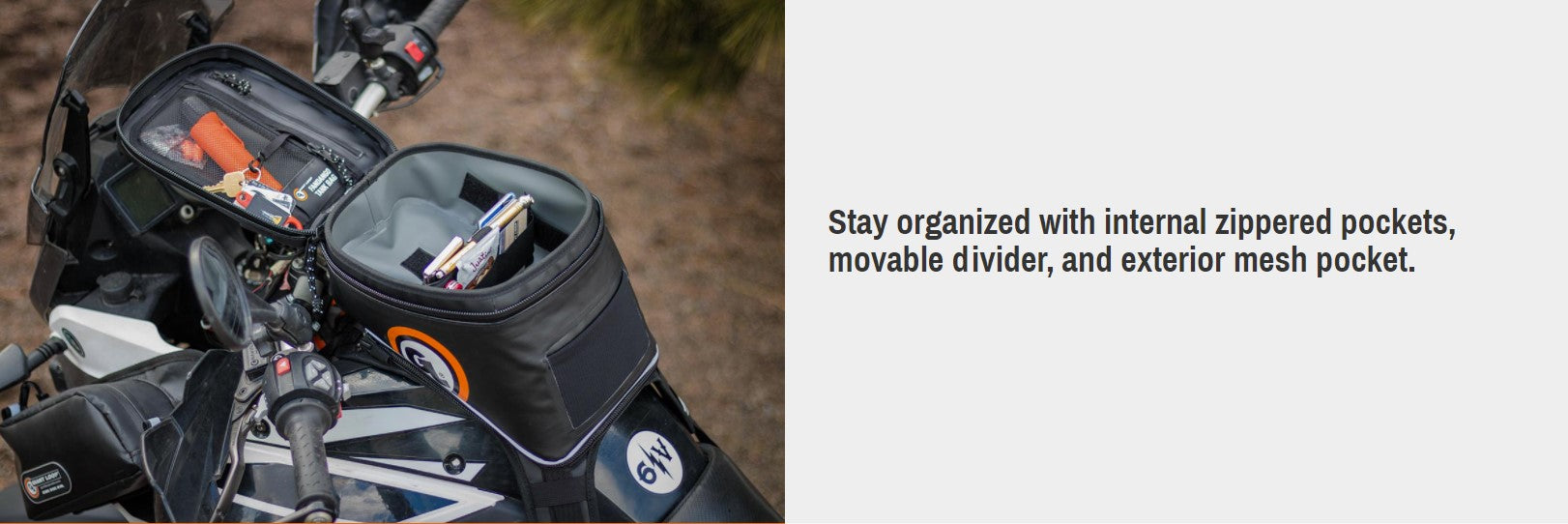 The Fandango Tank Bag’s universal design fits virtually any dirt bike, snow bike, enduro, dual sport, adventure, or street motorcycle make and model.
