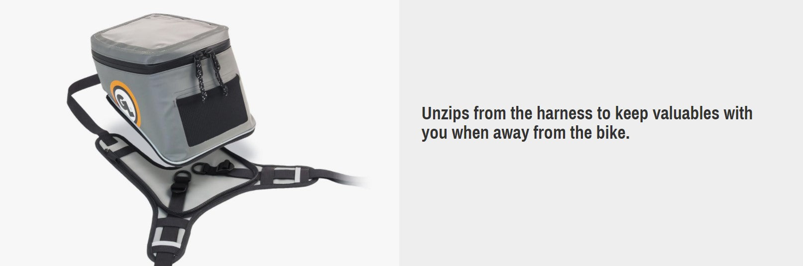 - Unzips from the harness to keep valuables with you when away from the bike.