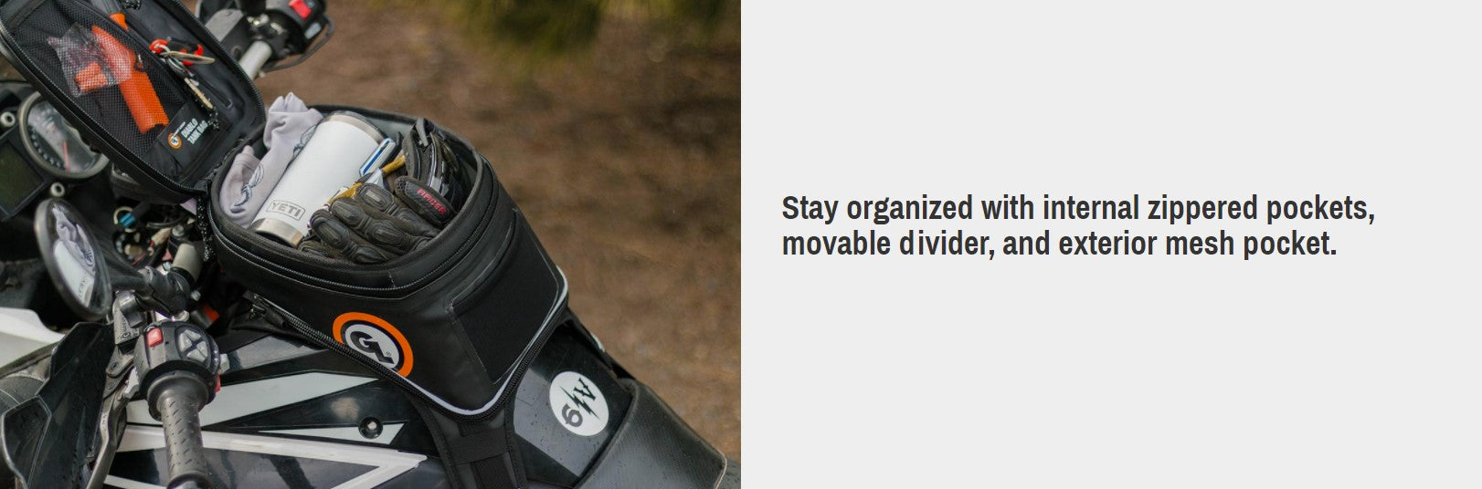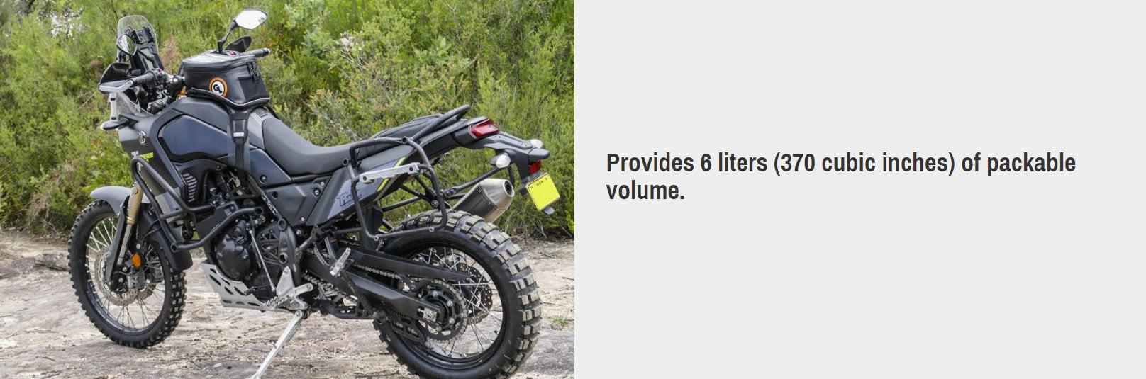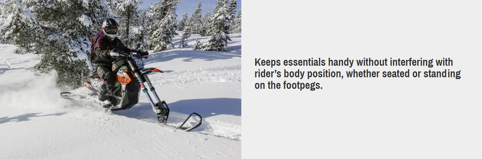 - Keeps essentials handy without interfering with rider’s body position, whether seated or standing on the footpegs.
