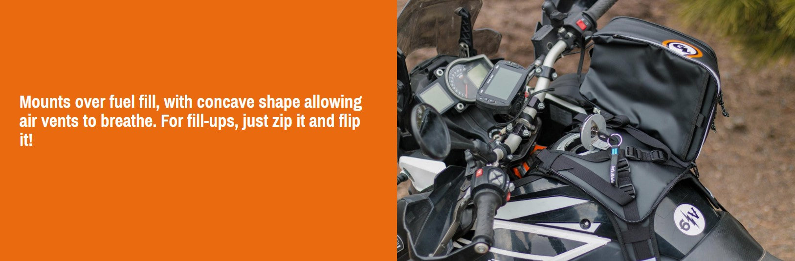 - Mounts over fuel fill, with concave shape allowing air vents to breathe. For fill-ups, just zip it and flip it!
