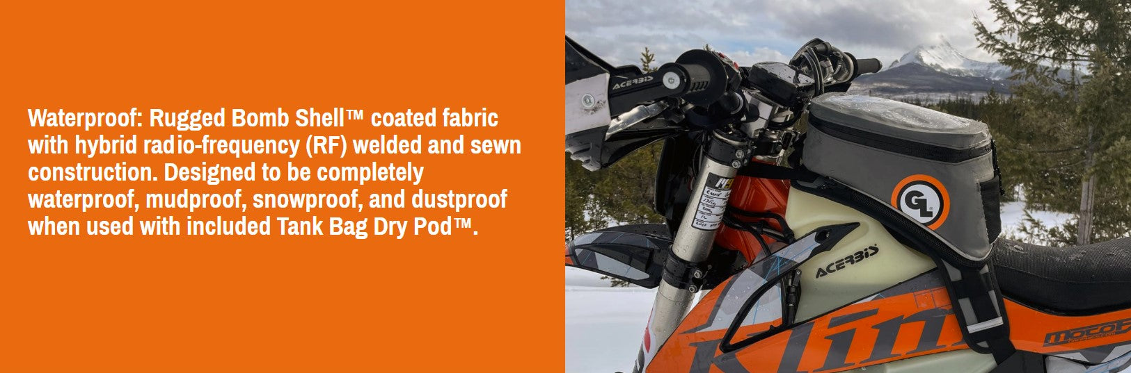 - Designed to be completely waterproof, mudproof, snowproof, and dustproof when used with included Tank Bag Dry Pod™.