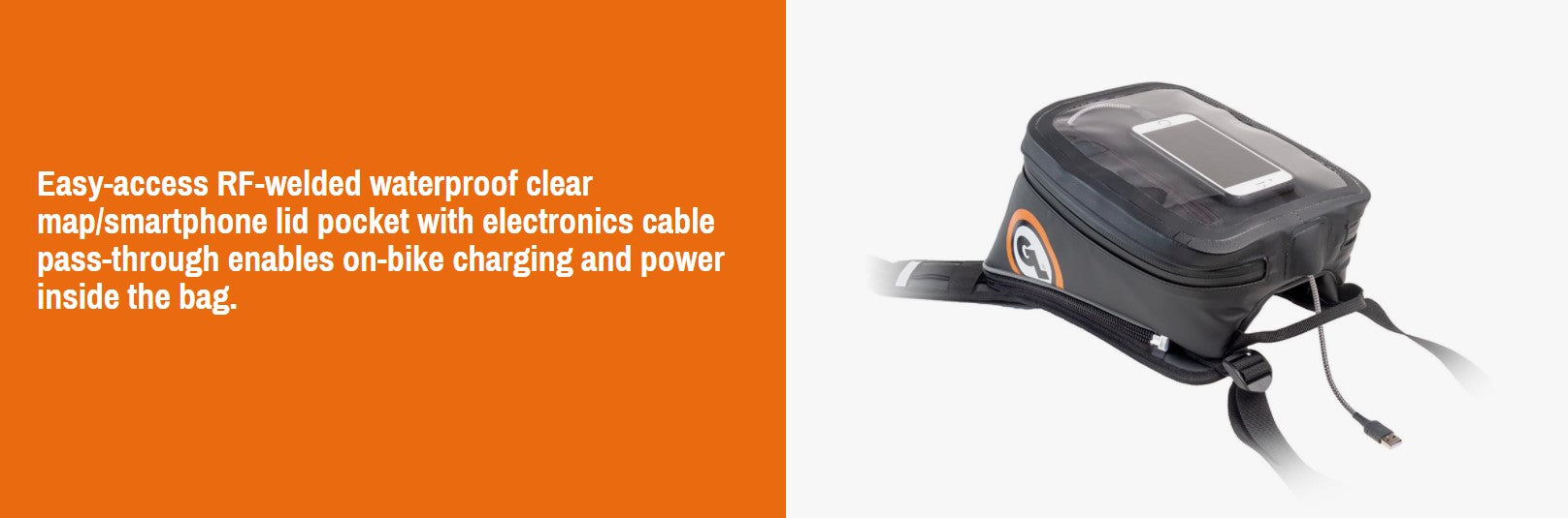 - Easy-access RF-welded waterproof clear map/smartphone lid pocket with electronics cable pass-through enables on-bike charging and power inside the bag.