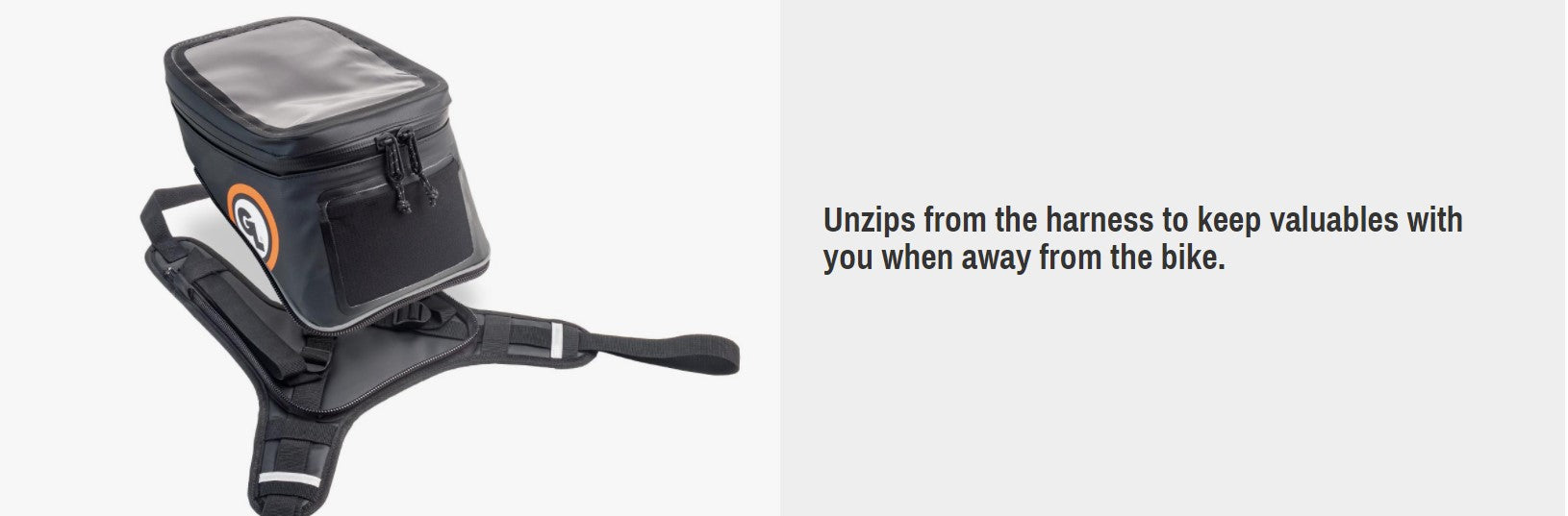 - Unzips from the harness to keep valuables with you when away from the bike.