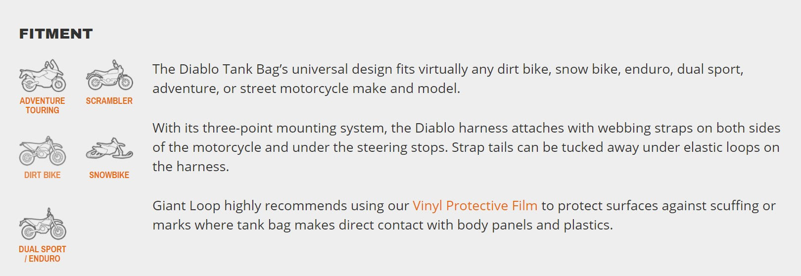 The Diablo Tank Bag’s universal design fits virtually any dirt bike, snow bike, enduro, dual sport, - adventure, or street motorcycle make and model.