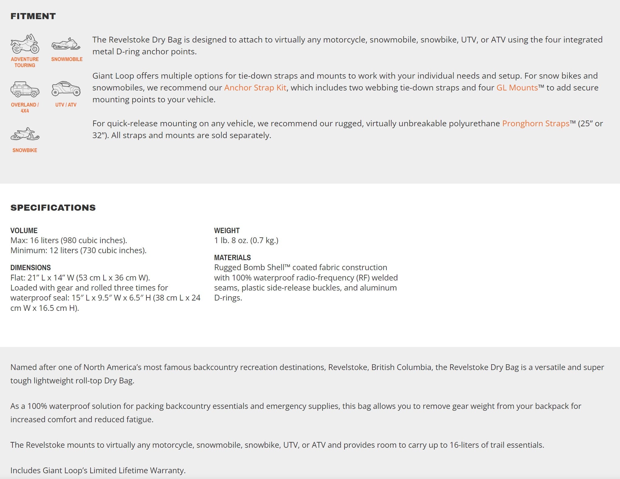 Named after one of North America’s most famous backcountry recreation destinations, Revelstoke, British Columbia, the Revelstoke Dry Bag is a versatile and super tough lightweight roll-top Dry Bag that provides room to carry up to 16-liters of trail essentials.. The Revelstoke is Giant Loop’s crossover roll-top dry bag that works on multiple vehicle types due to its versatile small rectangular shape that mounts to virtually any motorcycle, snowmobile, snowbike, UTV, or ATV for quick and easy access to gear. This bag allows you to remove gear weight from your backpack for increased comfort and reduced fatigue. With its 100% waterproof, mudproof, dustproof, and snow proof design, the Revelstoke delivers plenty of storage in a slim, trim profile. Ideal for carrying trail essentials such as extra layers, emergency supplies, snacks, tools, and other small items.