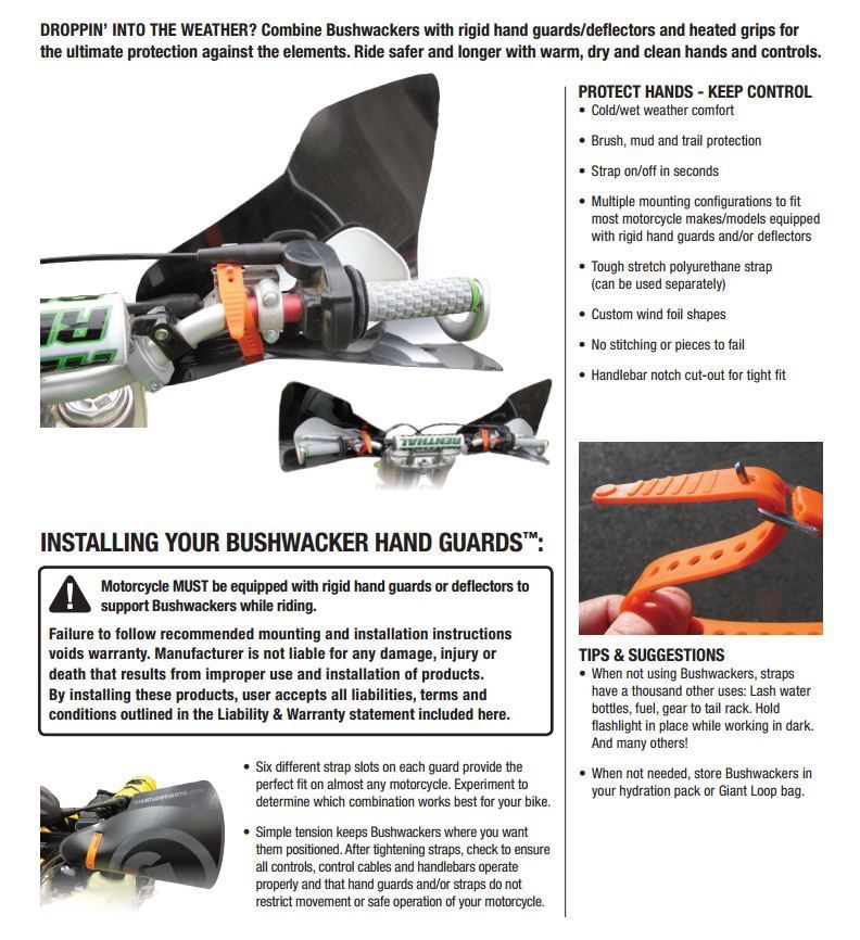 REQUIRED EQUIPMENT: Motorcycle must be equipped with rigid hand guards or deflectors to support Bushwackers while riding.