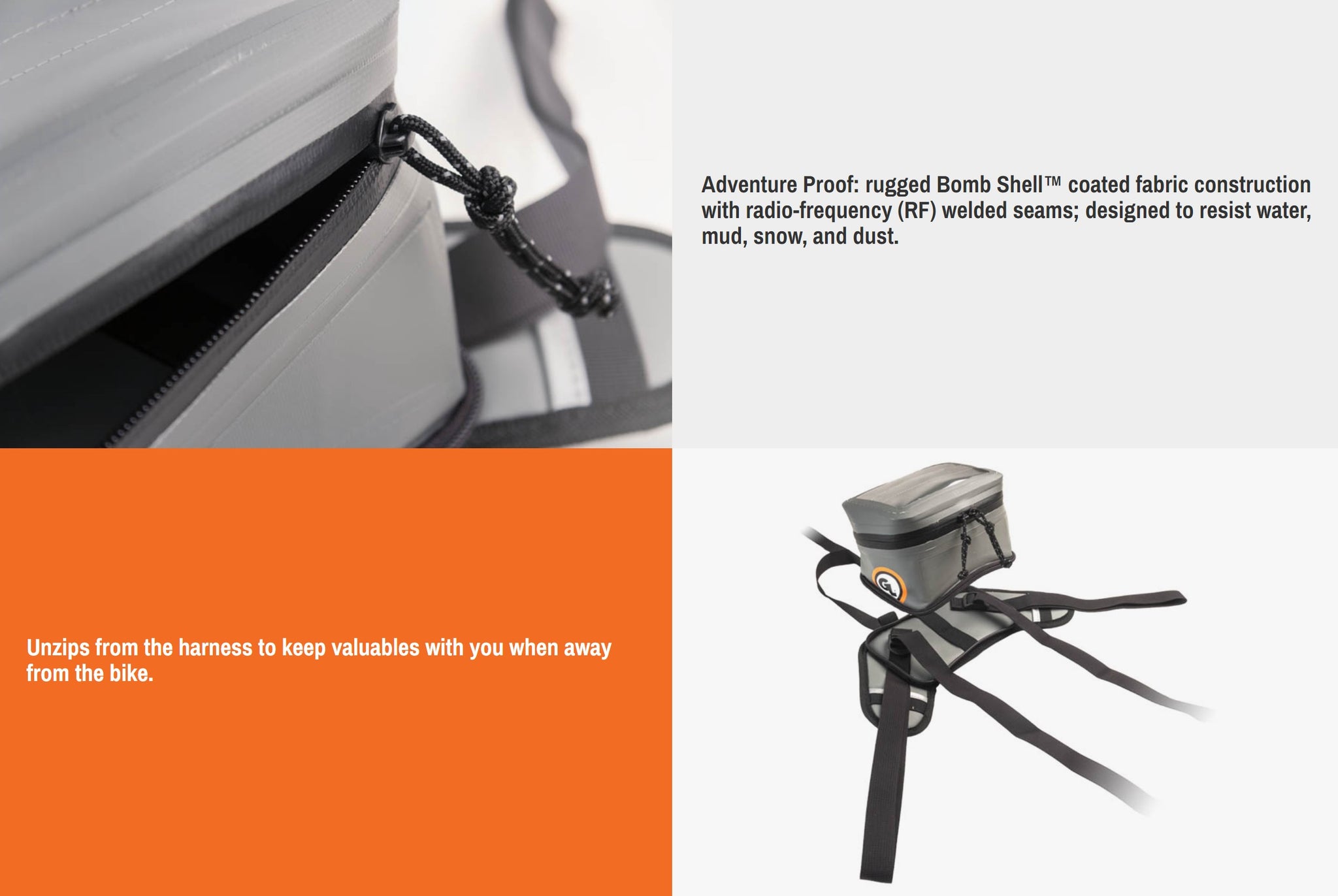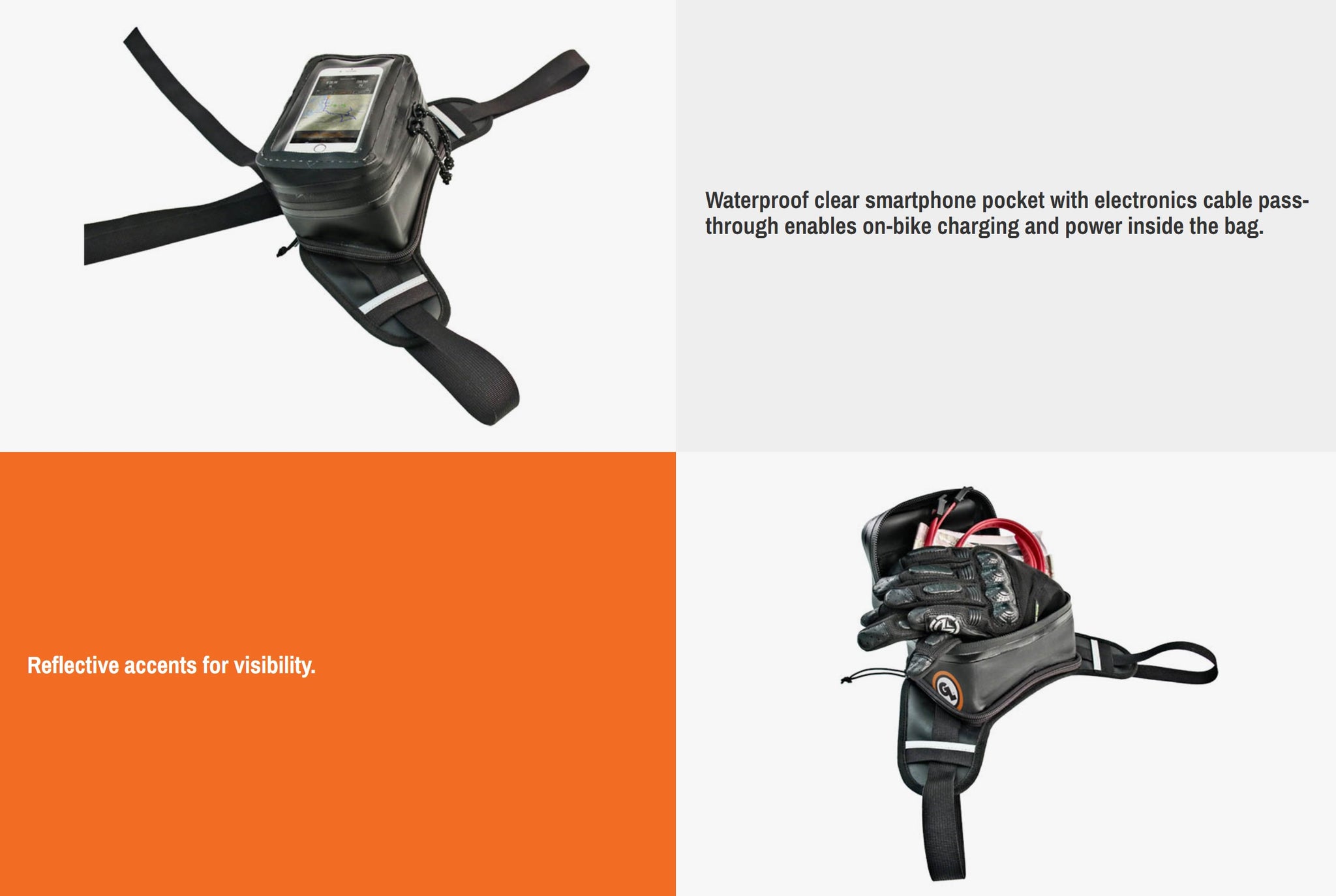 - Keeps all of the essentials handy and out of the way when sitting on seat front or standing on footpegs