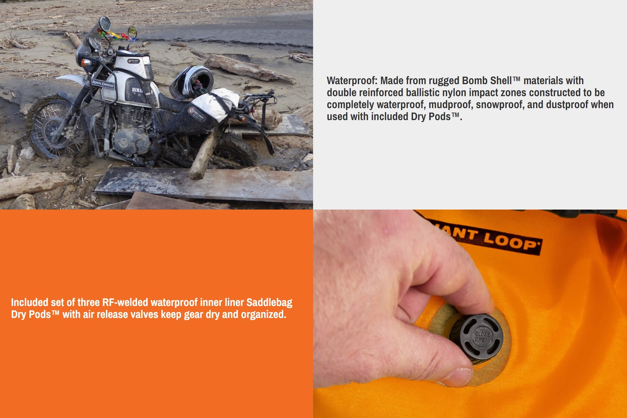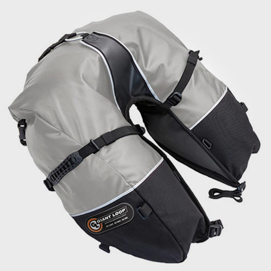 Introducing the Coyote Saddlebag Roll Top, a fresh update of our original flagship horseshoe-shaped dual sport and enduro Giant Loop Saddlebag design that launched our company in 2008. The Coyote Saddlebag Roll Top features a convenient rolling closure that seals out water and dust while maintaining the packable volume and all the unique “go light, go fast, go far” features of our zipper closure Coyote Saddlebag. Other enhancements include sewn-on molded rubber badges, Giant Loop branded grab handles that double as side compression straps, a set of 3 RF welded waterproof inner liner Saddlebag Dry Pods with air purge valves, and drains in the bottoms of the Saddlebag’s “legs” that allow water to escape if it manages to penetrate the highly water resistant out shell (yea, we understand – we’ve dunked our bikes in streams crossings, too!).