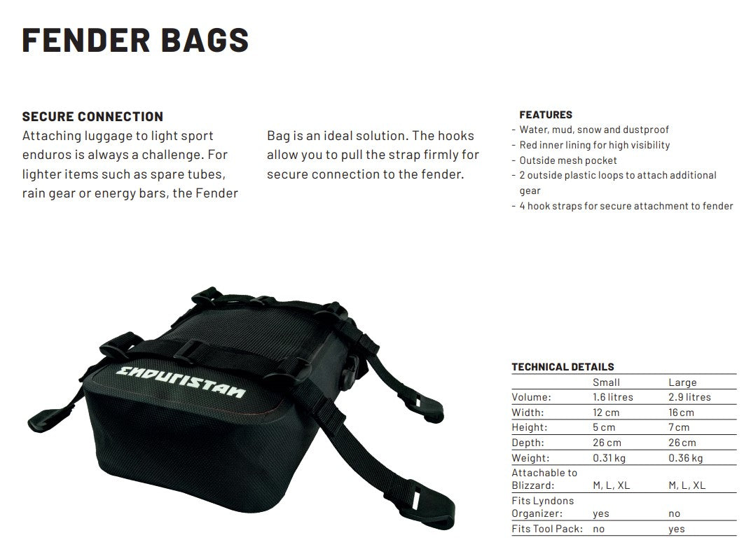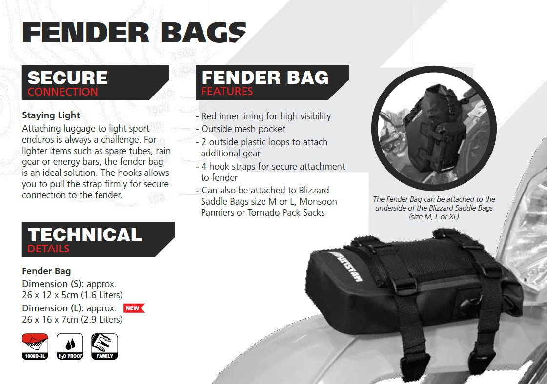 - The Fender Bag can be attached to the underside of the Blizzard Saddle Bags (size M, L or XL), Monsoon Panniers or Tornado Pack Sacks