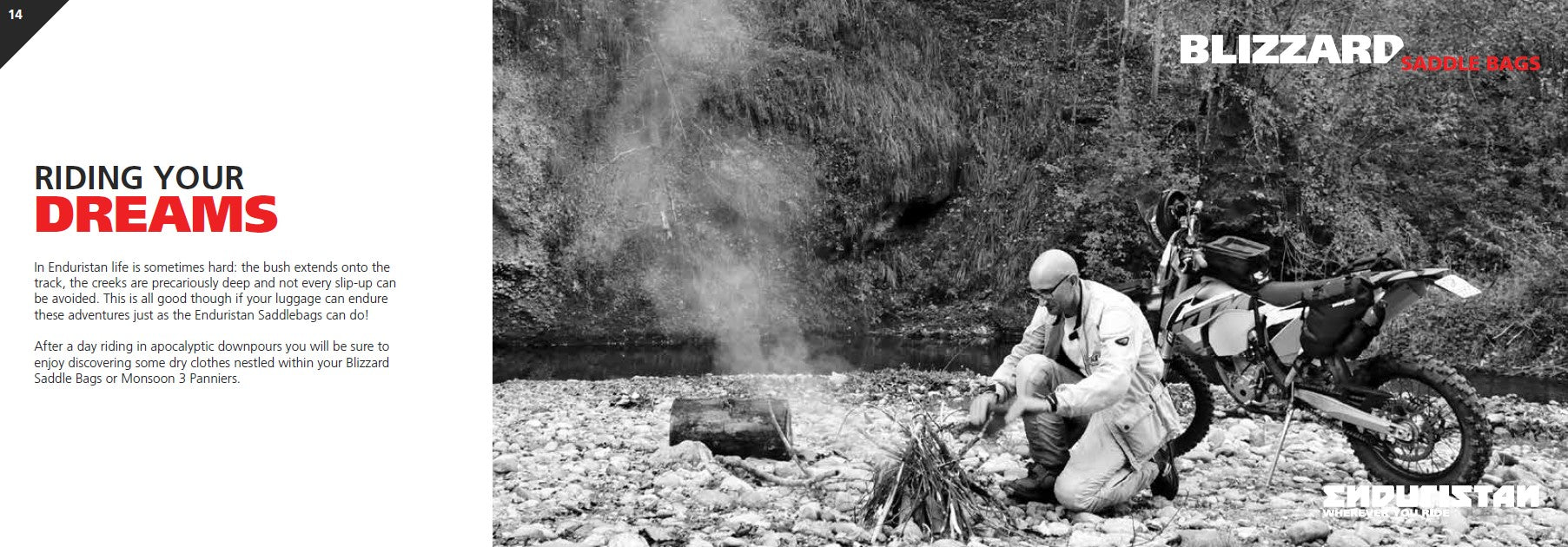 In Enduristan, life is sometimes hard: the bush extends onto the track, the creeks are precariously deep and not every slip-up can be avoided. This is all good though, if your luggage can endure these adventures just as the Enduristan Saddlebags can!