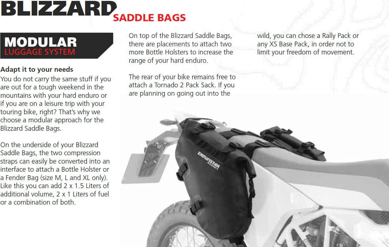 On top of the Blizzard Saddle Bags, there are placements to attach two more Bottle Holsters to increase the range of your hard enduro. The rear of your bike remains free to attach a Tornado 2 Pack Sack, Rally Pack or any XS Base Pack.