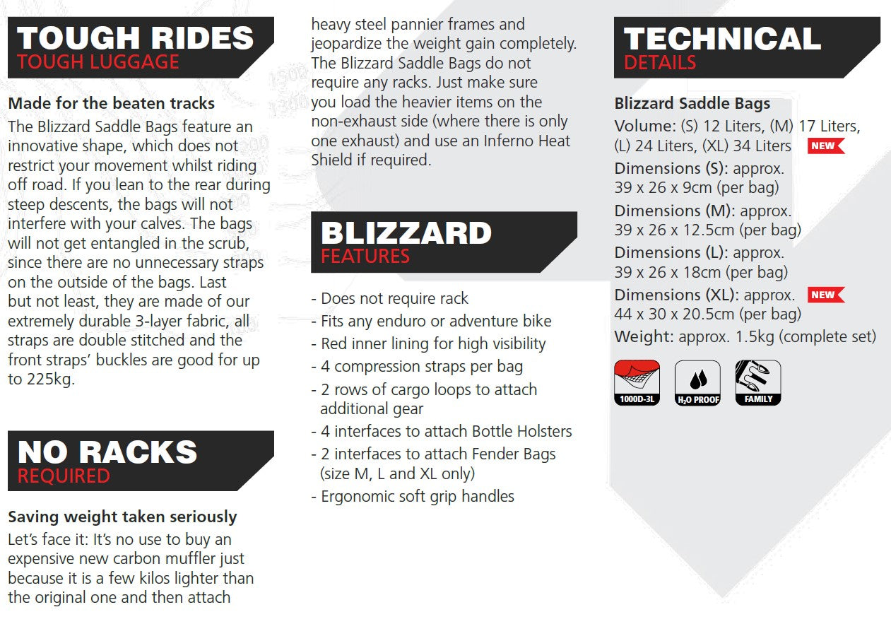 The Blizzard Motorcycle saddle bags are a top quality modular luggage system that are rugged, waterproof set of off road saddlebags. After a day riding in apocalyptic downpours you will be sure to enjoy discovering some dry clothes nestled within your Blizzard Saddle Bags.